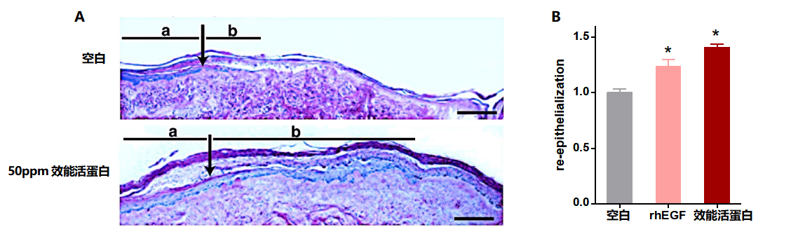 结论:效能活蛋白较对照组显著促进人工皮肤再上皮化与伤口愈合;效果优于rhEGF(重组人表皮生长因子)