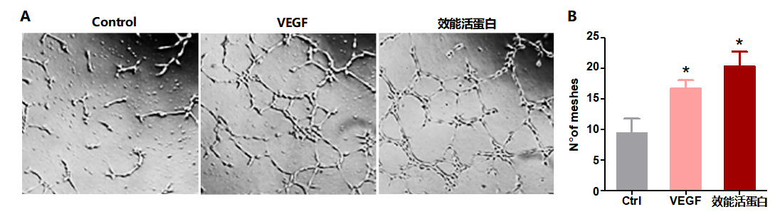 体外血管生成测试:在含或不含效能活蛋白、VEGF或凝血酶的无血清培养基中孵育并接种于生长因子减少的基质胶顶部,在接种后6~8h拍摄图像