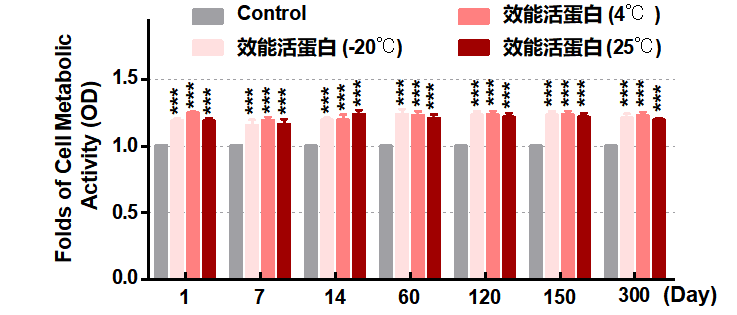 结论:在-20℃(冷冻),4℃(冷藏)以及25℃(室温)多种条件下,效能活蛋白较对照组在长达300天时间内均能够显著激活人上皮细胞,增加细胞代谢活性,且活性无衰减;此项监测实验将持续2年