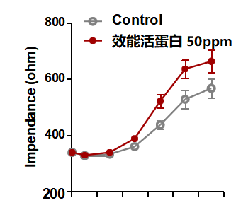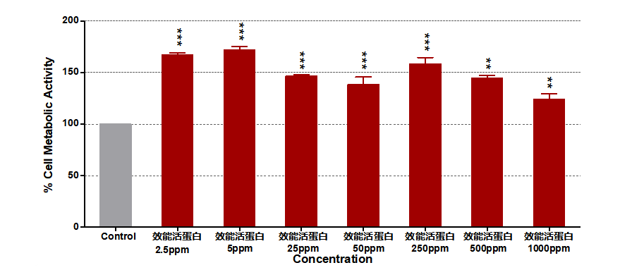 结论:效能活蛋白较对照组在2.5~1000ppm浓度范围均能够显著激活人上皮细胞,增加细胞代谢活性,进而验证其在高达1000ppm浓度下均显示极低细胞毒性,在极限高浓度下可直接安全使用。