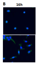 上皮细胞铺展实验:16h(绿色:肌动蛋白;蓝色:细胞核);